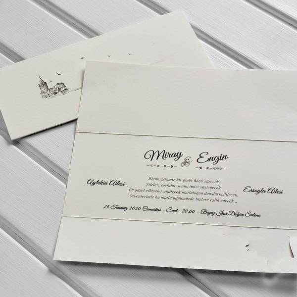 Invitatie de nunta simpla si eleganta, cu insertii aurii. Invitatia contine plic alb clasic.